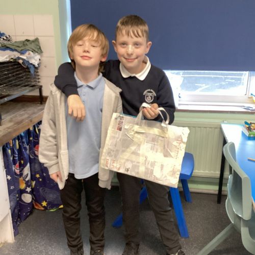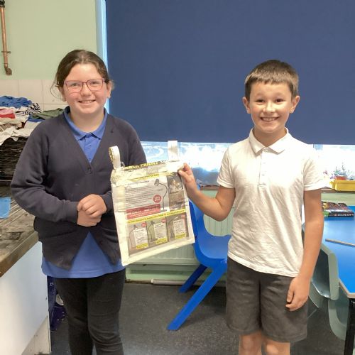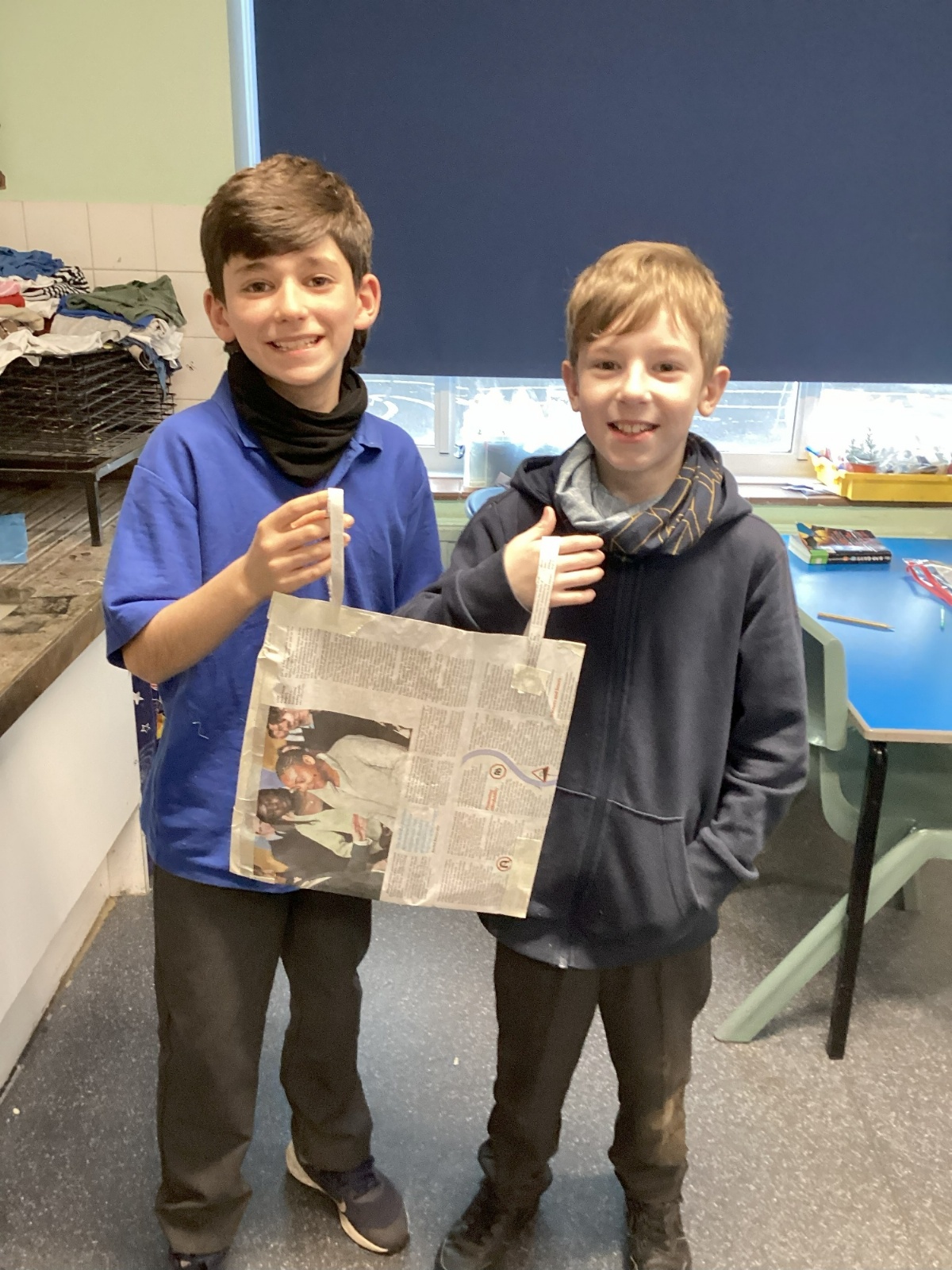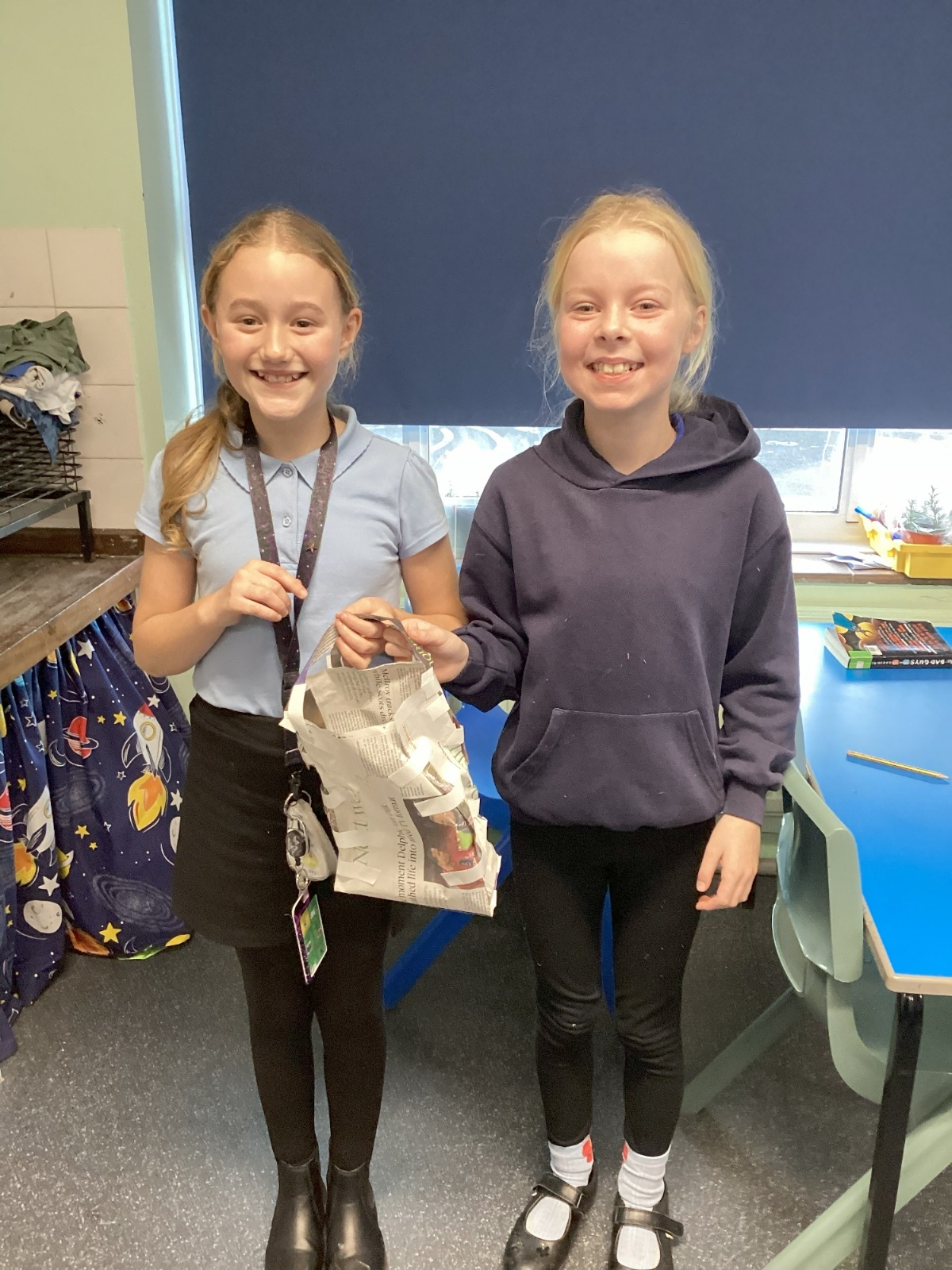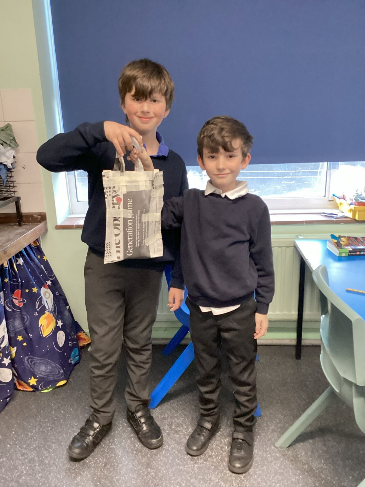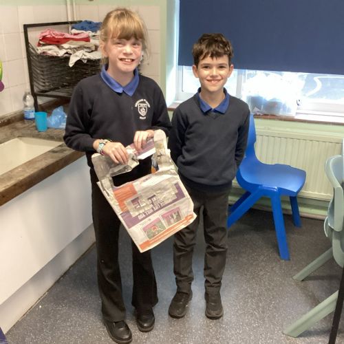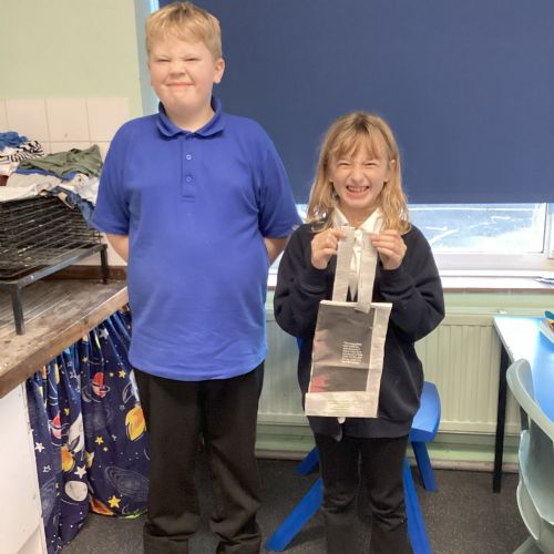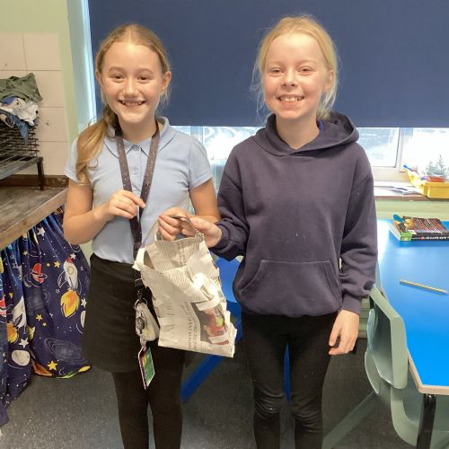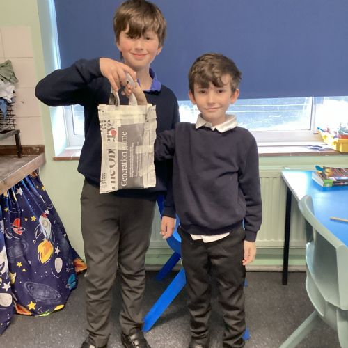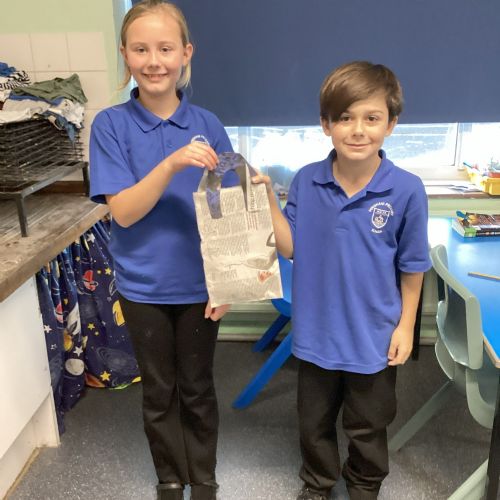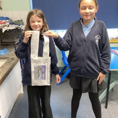 Our challenge was to turn a single sheet of newspaper into a bag. We thought carefully about our designs and how we were going to make them strong. We tested our bags by seeing how many pencil crayons they would hold, then pushed them to their limits with our reading books. Not only was it great fun, but it made us really think about how bags are designed in order to fulfil their purpose.
