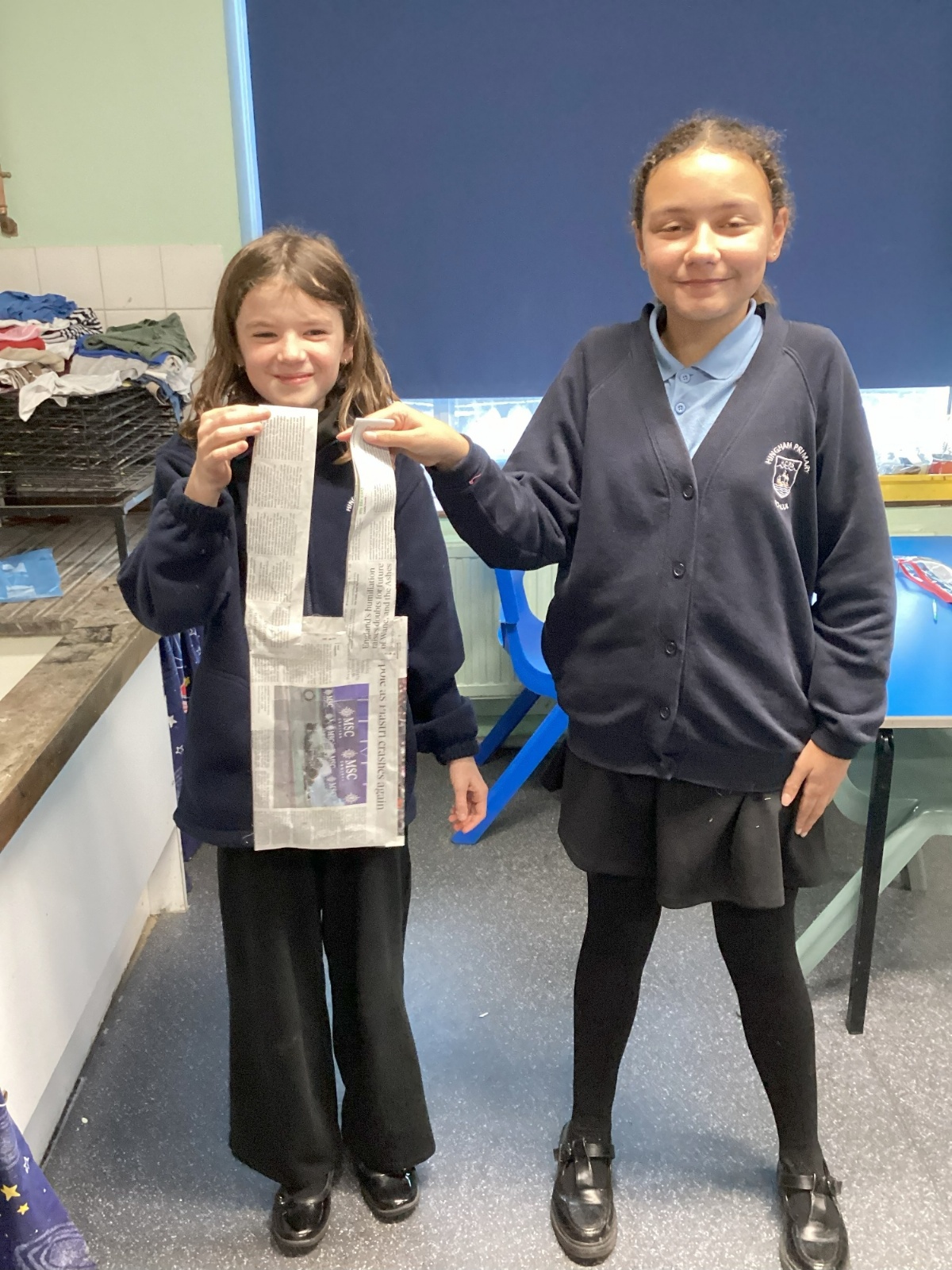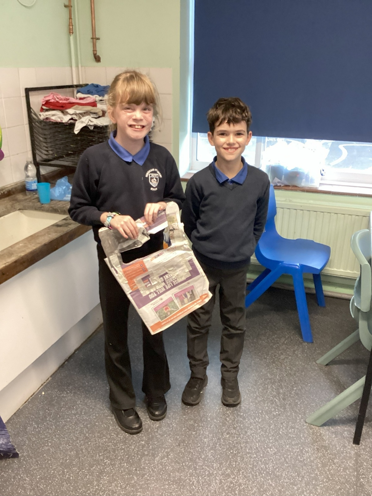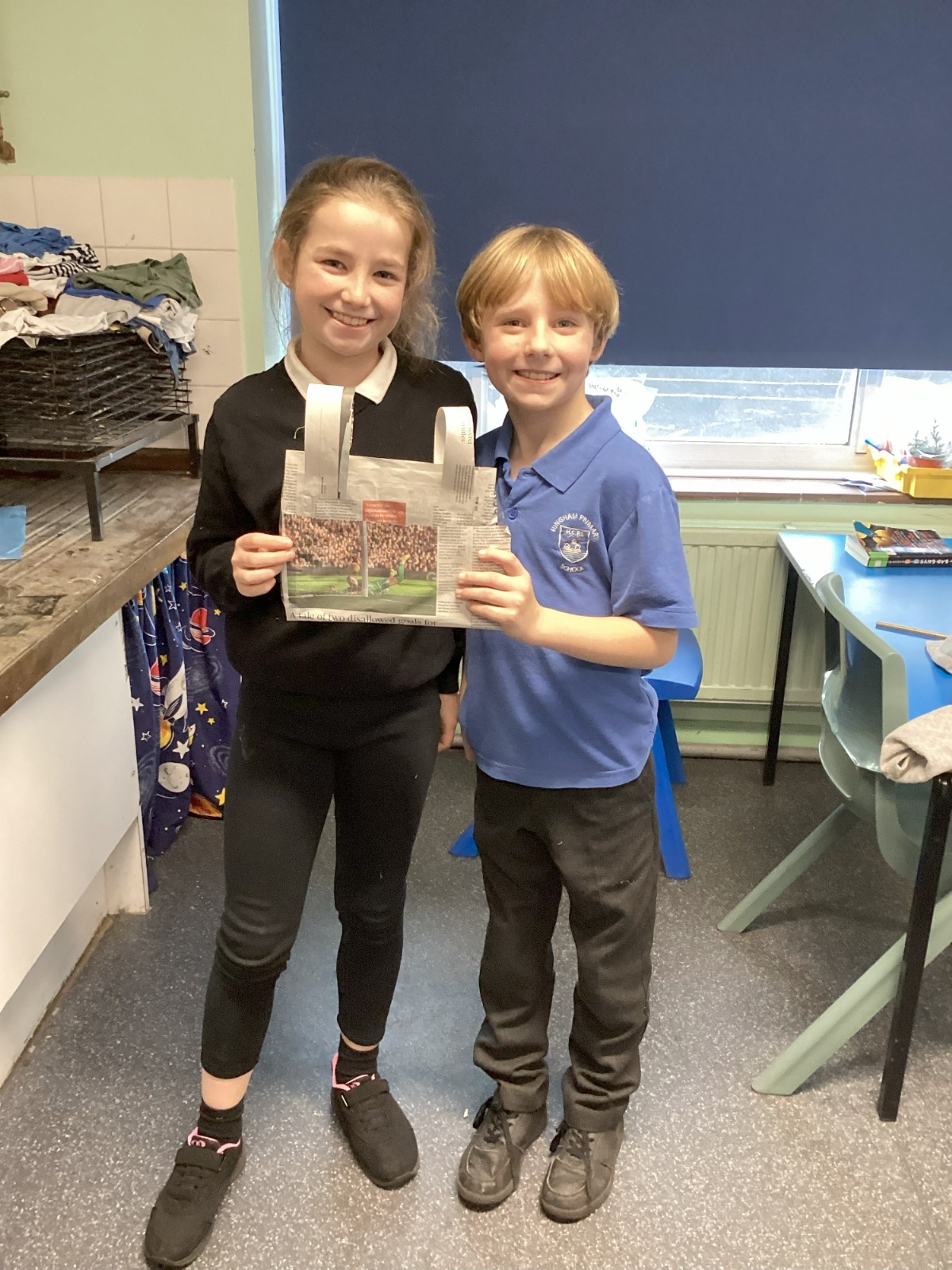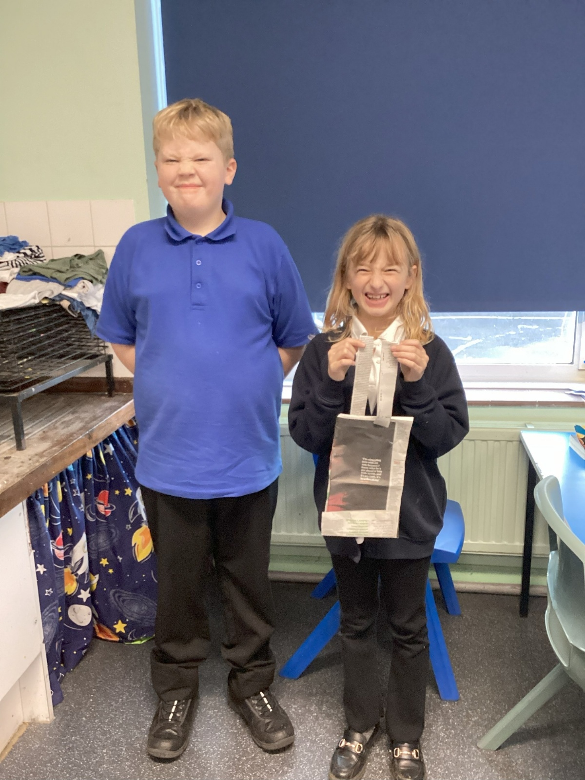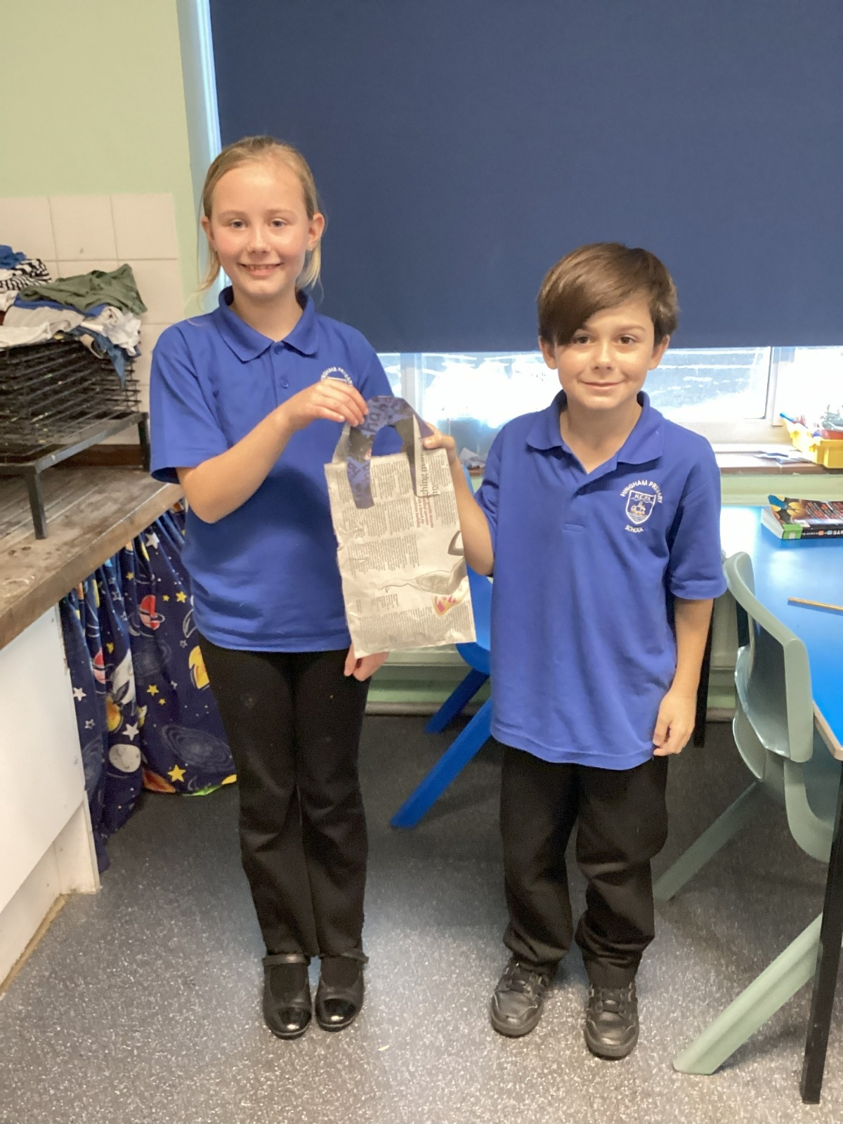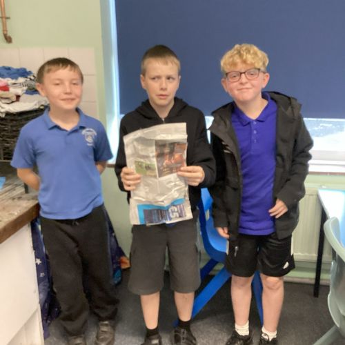 Our challenge was to turn a single sheet of newspaper into a bag. We thought carefully about our designs and how we were going to make them strong. We tested our bags by seeing how many pencil crayons they would hold, then pushed them to their limits with our reading books. Not only was it great fun, but it made us really think about how bags are designed in order to fulfil their purpose.