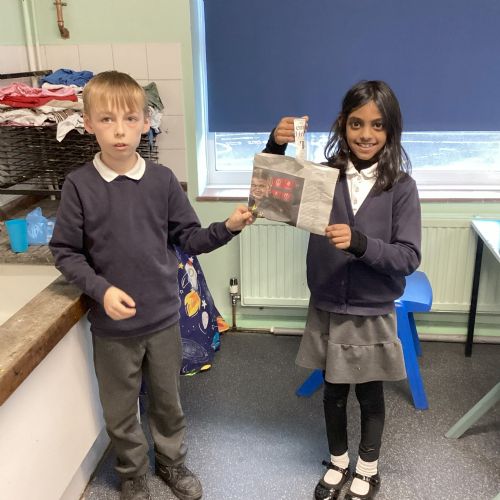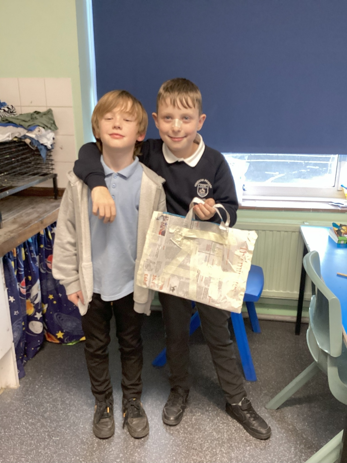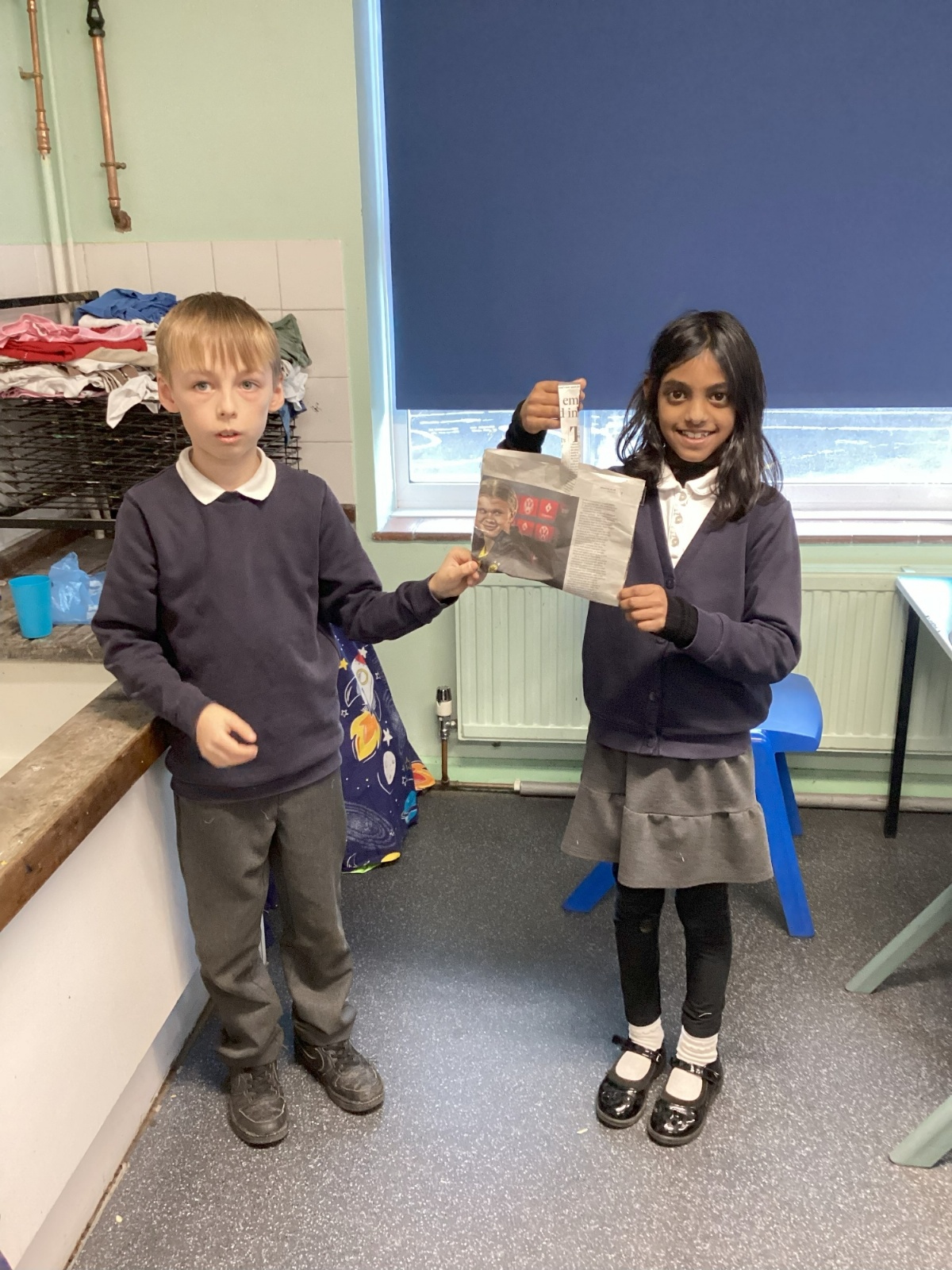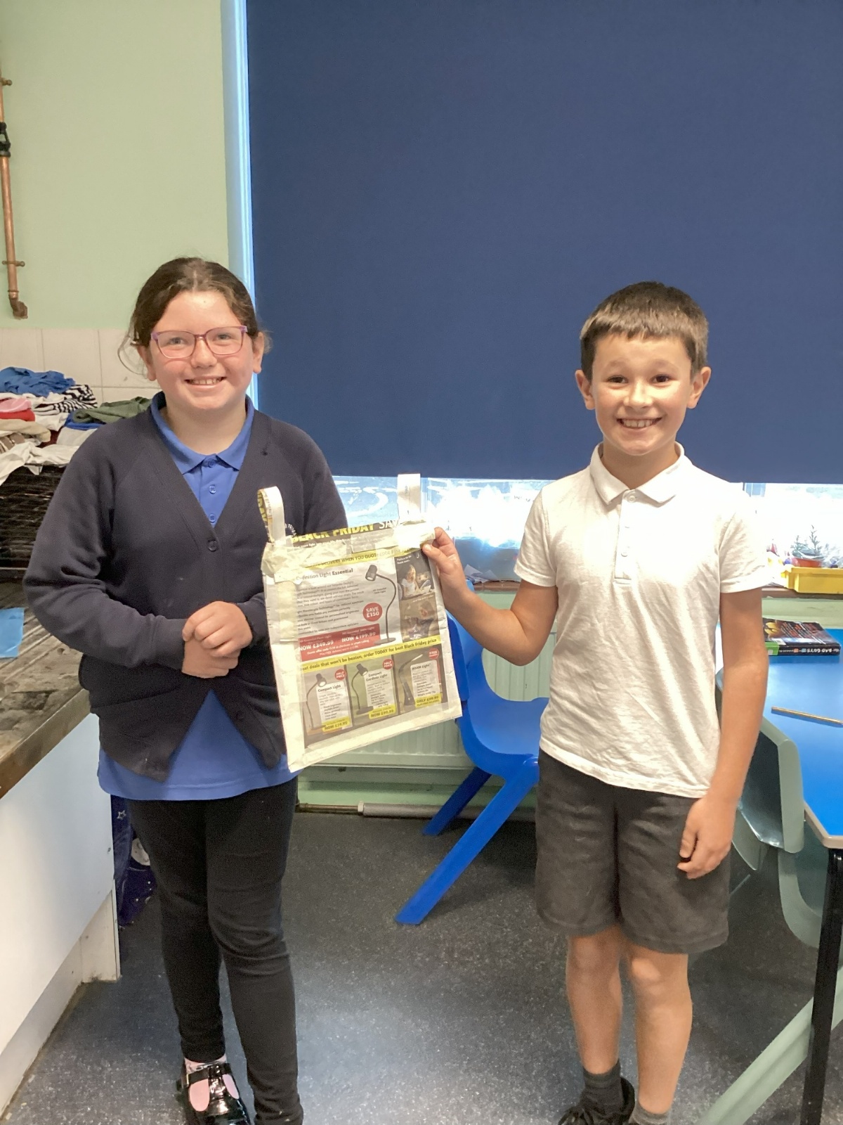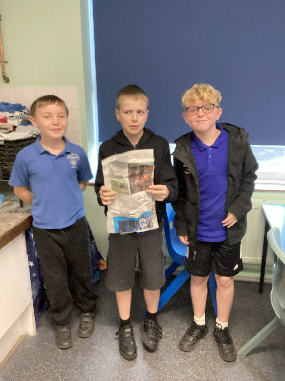 Our challenge was to turn a single sheet of newspaper into a bag. We thought carefully about our designs and how we were going to make them strong. We tested our bags by seeing how many pencil crayons they would hold, then pushed them to their limits with our reading books. Not only was it great fun, but it made us really think about how bags are designed in order to fulfil their purpose.